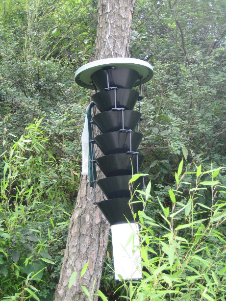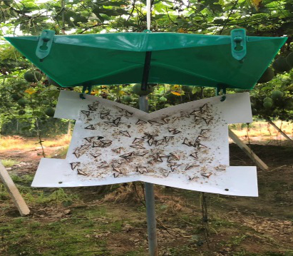群集誘殺法是將人工合成的化學(xué)信息素混合物加在一基質(zhì)中,置于田間并使之緩慢、均勻釋放、以引誘雄蛾,并用特定物理結構的誘捕器捕殺靶標害蟲(chóng),從而降低雌雄蛾交配,降低后代種群數量從而達到防治目的。